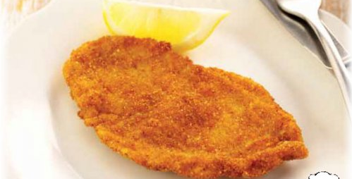 Şinitzel Panko ekmekleri ile kaplanmış kızarmış piliç. Patates kızartması, pilav, domates ve turşu ile servis edilir |